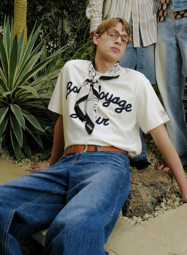 핸드 스티치 기법으로 연출한 체인 자수 포인트 디테일이 들어간 세터의 본보야지 로고 반팔 티셔츠입니다.