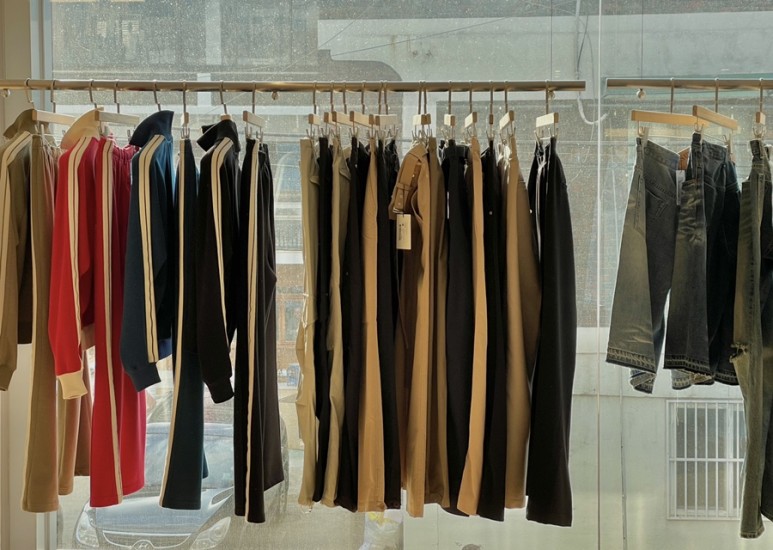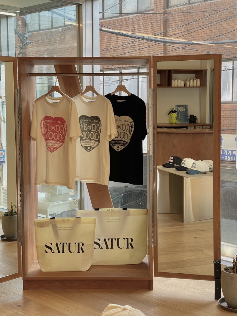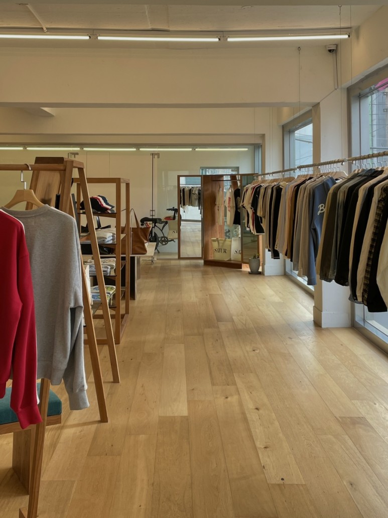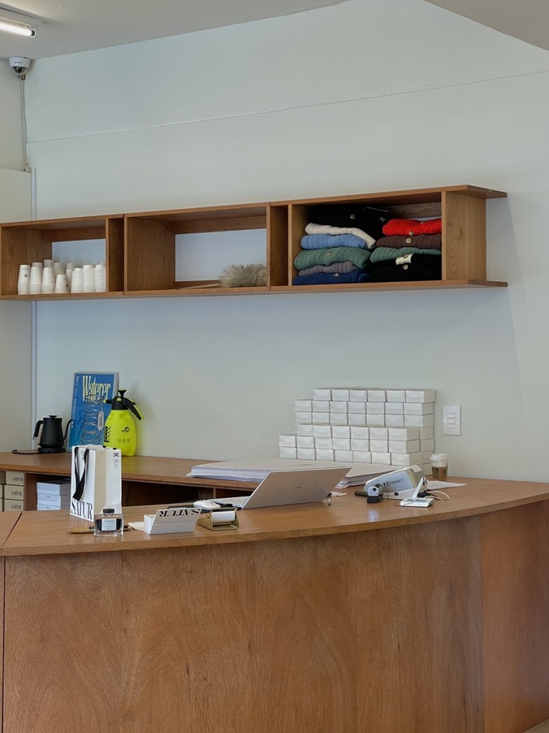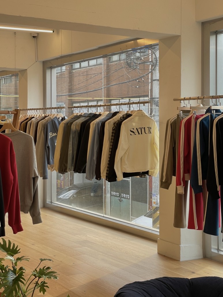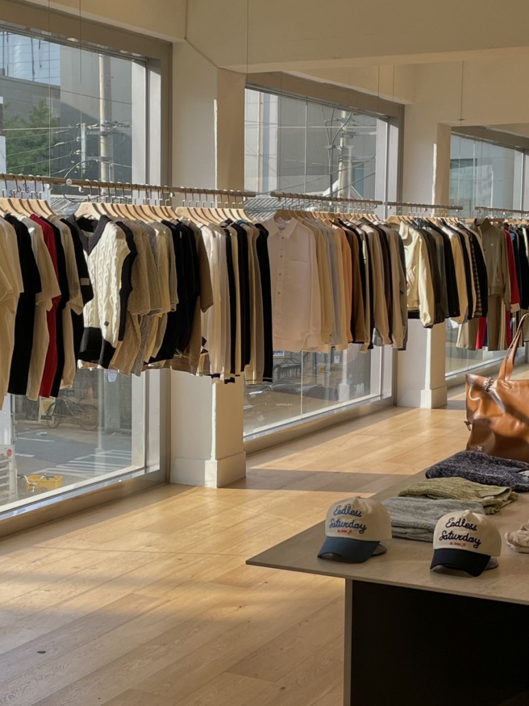 창가 쪽 스틸 행거를 제외하면 바닥이나 선반에 우드가 많아서 그런지 쇼룸이 되게 따뜻한 느낌이 들어요.