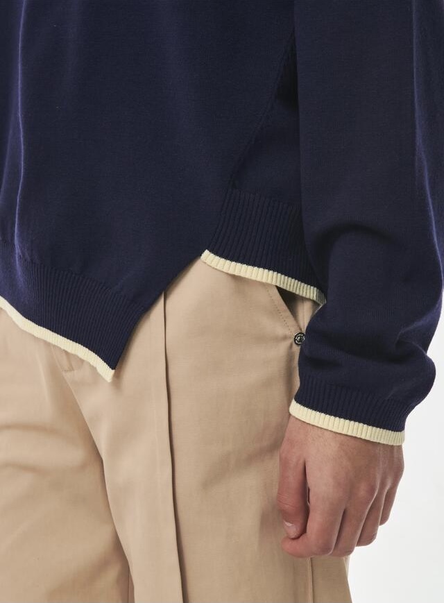 칼라 배색과 언밸런스의 밑단 디테일이 돋보이는 세터의 카라 하프집업 니트입니다.